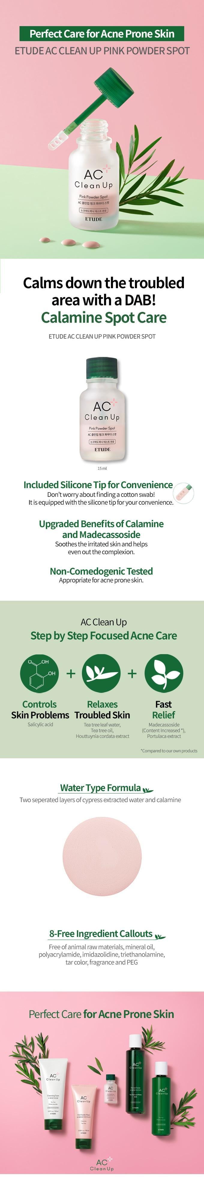 AC Clean Up Pink Powder Spot 15ml This spot care product with Calamine soothes problem areas intensively and fast. - Included Silicone Tip for Convenience Don't worry about finding a cotton swab! It is equipped with the silicone tip for your convenience - Upgraded Benefits of Calamine and Madecassoside Soothes the irritated skin and helps even out the complexion - Non-Comedogenic Tested Proven safe for acne-prone skin